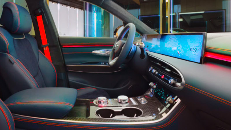 وتستمر التعديلات داخل المقصورة، حيث تأتي بمقاعد مكسوة بجلد نابا بلون أزرق أولترامارين (Ultramarine) مع إضافات من الشمواه، إلى جانب مساند رأس تحمل شعارات جينيسيس البارزة.