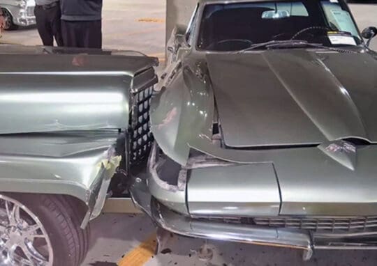 حيث اصطدمت شاحنة ويليس 1958 ريستو-مود (Willys 1958 Restomod) بسيارة كورفيت سي 2 (Corvette C2) طراز 1966 وهي مركونة، وحطمتها ودفعتها نحو سيارات أخرى بجوارها، ما أدى أيضًا إلى تضرر سيارة بونتياك ترانس آم (Pontiac Trans Am) طراز 1977 وأخرى كورفيت سي 7 زد آر 1 (Corvette C7 ZR1) موديل 2019، وأسفر الحادث عن وقوع إصابات.