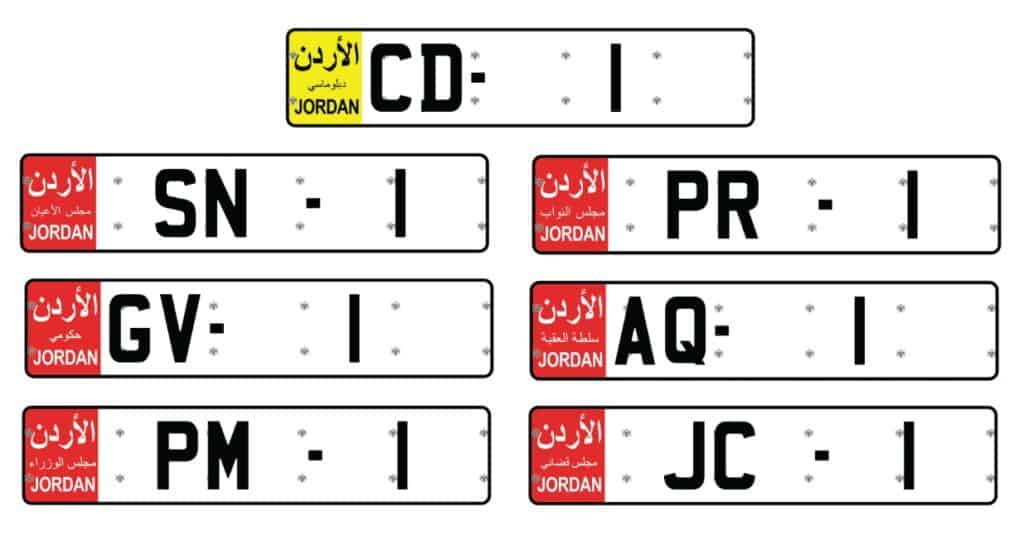 ويُكتب في أعلى هذا المربع كلمة “الأردن” باللغة العربية، وتحتها اسم الجهة المالكة للمركبة مثل: دبلوماسي، مجلس الأعيان، حكومي، مجلس الوزراء، سلطة العقبة، مجلس النواب، المجلس القضائي.