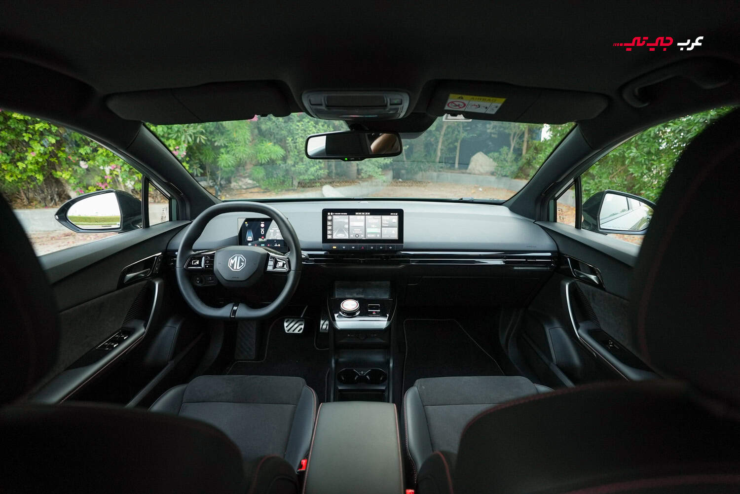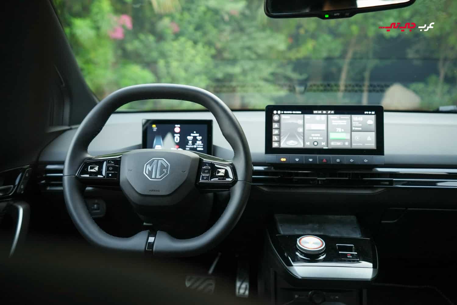 في الداخل، اختارت إم جي البساطة الذكية. لا زر تشغيل تقليدي، فقط اجلس واضغط الفرامل لتستعد للانطلاق. ناقل الحركة قرص دوّار أنيق يترك المقصورة أكثر انسيابية.