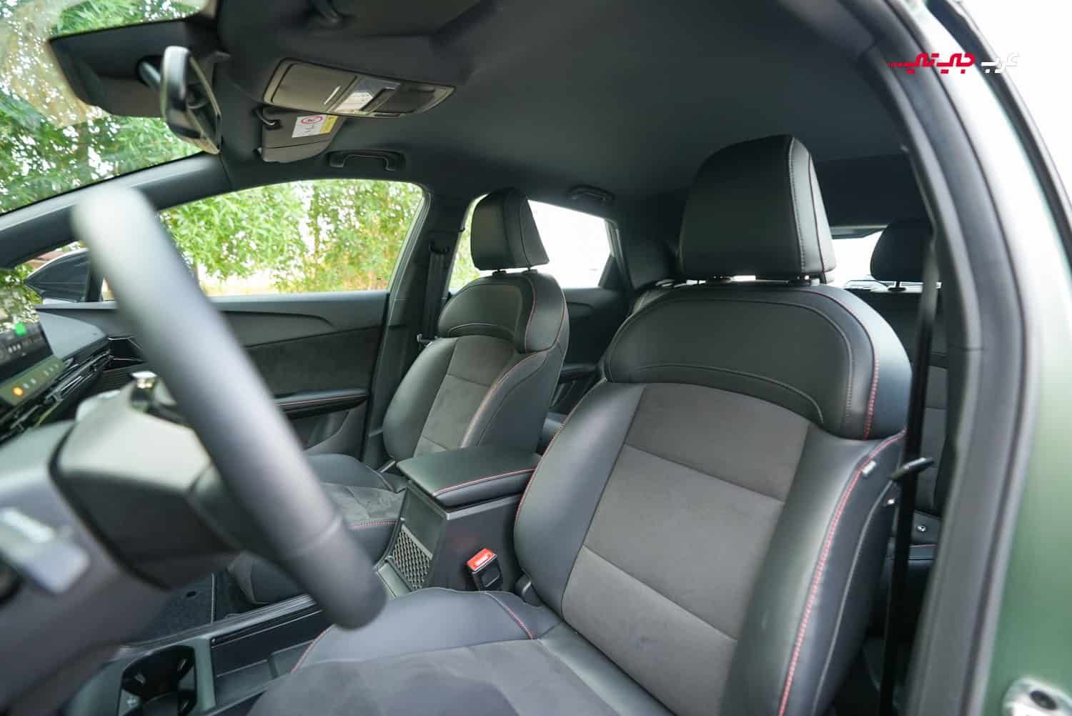 لكن المقاعد هي سر التميز هنا. تصميم رياضي مغطى بمزيج من الألكانتارا والجلد الصناعي مع خياطة برتقالية ملفتة، تمنحك إحساسًا بالثبات والثقة عند القيادة السريعة. وحتى ركاب المقاعد الخلفية سيجدون مساحة رحبة للرؤوس والأرجل، ما يؤكد أن العملية لم تُضحَّ من أجل الأداء.