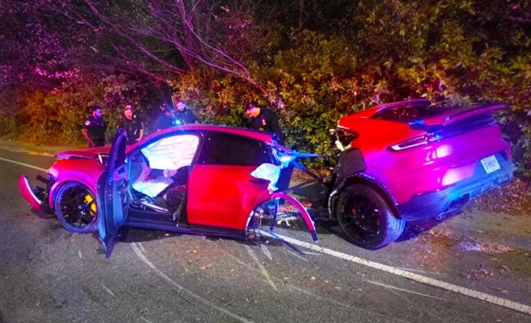 سيارة بورش تنقسم إلى نصفين بعد اصطدامها بشجرة
